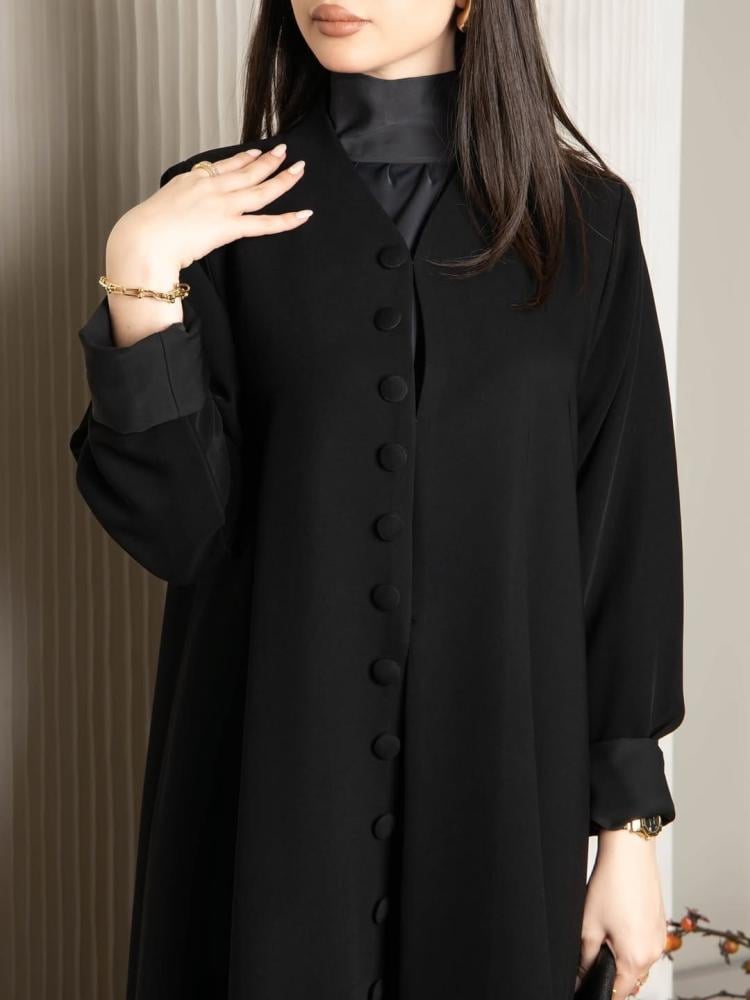 - الأزرار موزونة بشكل يخلي الخط الأمامي مستقيم، وفي نفس الوقت عملية تسهّل الارتداء.